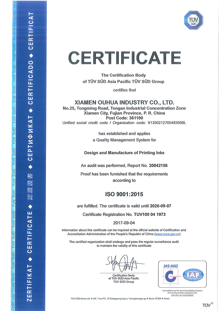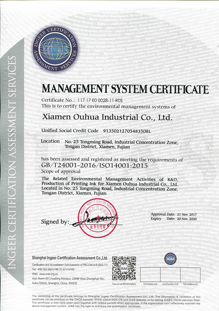 廈門歐化實業(yè)有限公司創(chuàng)建于二OO一年八月,位于廈門市同安工業(yè)集中區(qū)同明路25號,占地面積超過39000平方米,擁有各種符合國家相關(guān)法規(guī)的甲、乙類生產(chǎn)車間和倉庫,先進專業(yè)油墨生產(chǎn)設(shè)備、高新科技實驗設(shè)備200多臺(套)。公司先后獲獎國家級高新技術(shù)企業(yè)、國家專精特新“小巨人”企業(yè)、廈門市科技小巨人領(lǐng)軍企業(yè)、廈門優(yōu)質(zhì)品牌等榮譽。通過ISO9001:2015質(zhì)量管理體系、ISO14001:2015環(huán)境管理體系、ISO45001:2018職業(yè)健康安全管理體系、國家安全標準化三級企業(yè)、知識產(chǎn)權(quán)管理體系、兩化融合管理體系等認證。